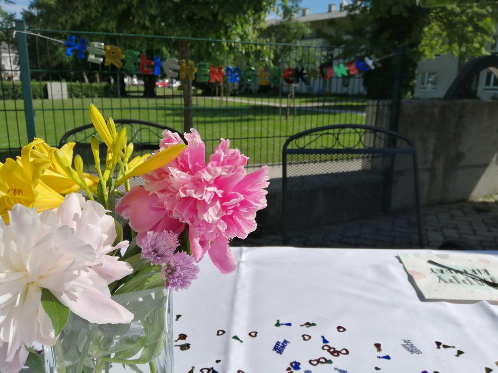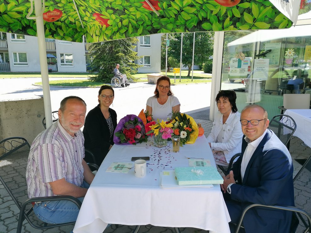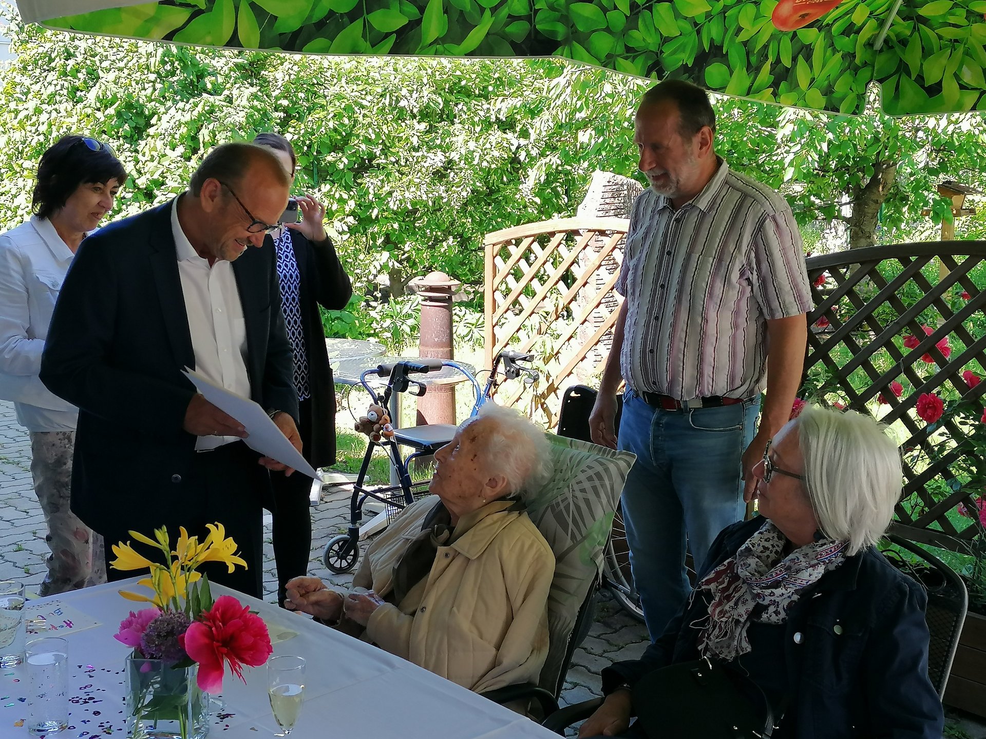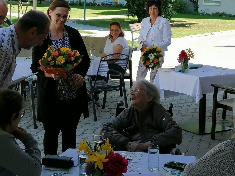 Gemeinsam mit ihren Angehörigen feierten die Bewohner bei Kaffee, Torte und gefüllten Jourgebäck auf unserer Terasse. So durften sich die Bewohnerinnen über Blumen, der Herr über Pralinen eine Urkunde und einer weiteren kleinen Aufmerksamkeit von der Gemeinde erfreuen.