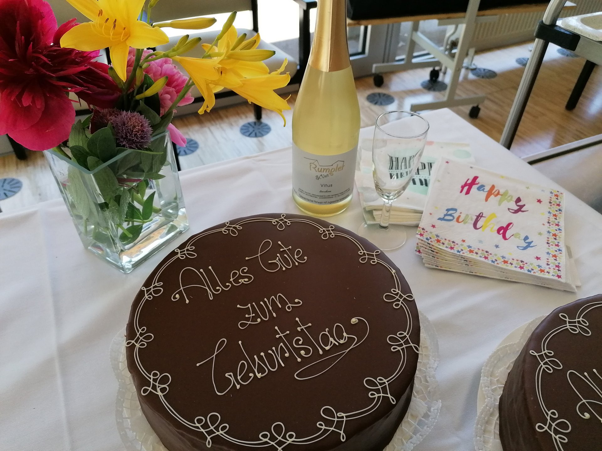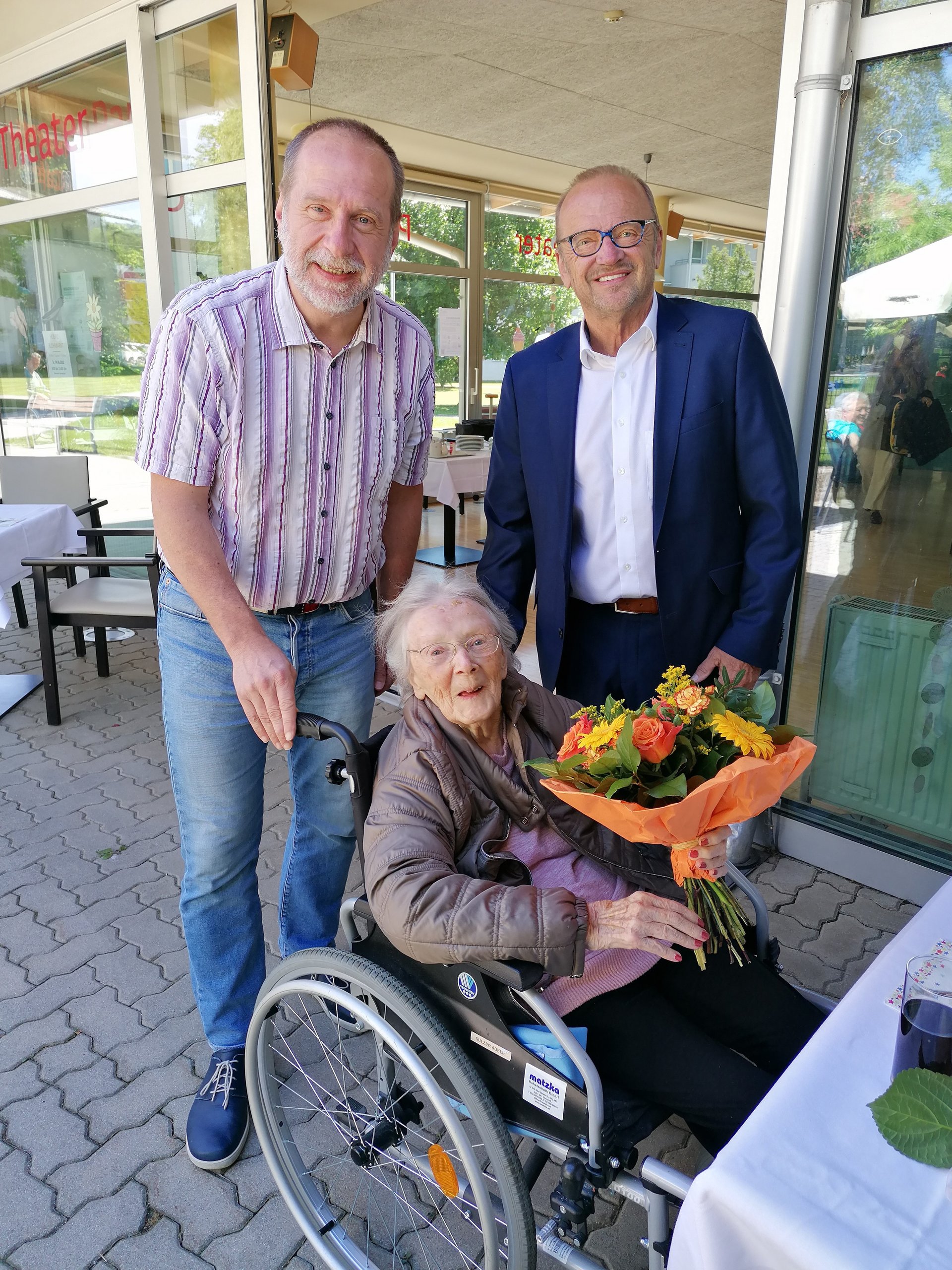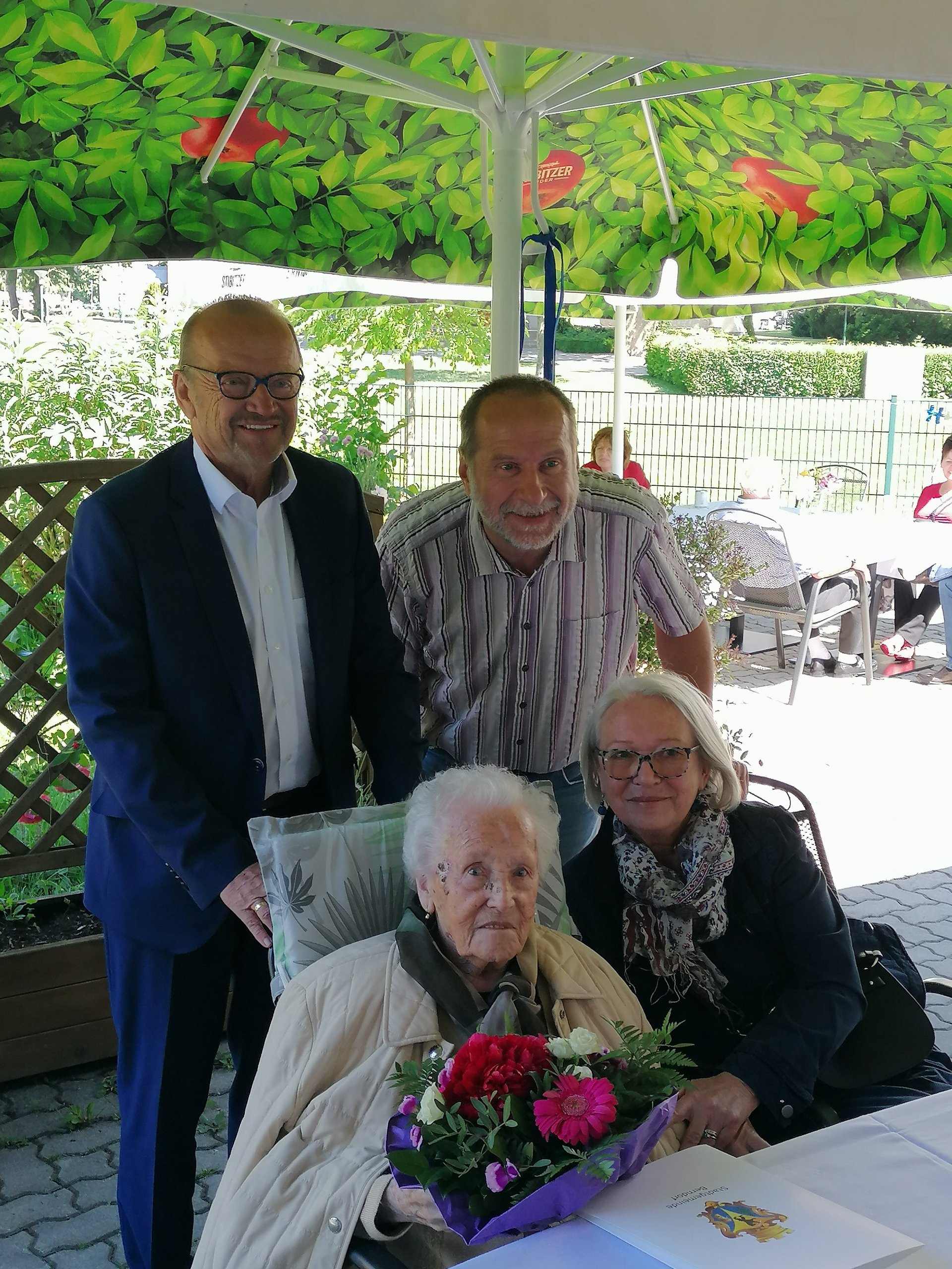 Gemeinsam mit ihren Angehörigen feierten die Bewohner bei Kaffee, Torte und gefüllten Jourgebäck auf unserer Terasse. So durften sich die Bewohnerinnen über Blumen, der Herr über Pralinen eine Urkunde und einer weiteren kleinen Aufmerksamkeit von der Gemeinde erfreuen.