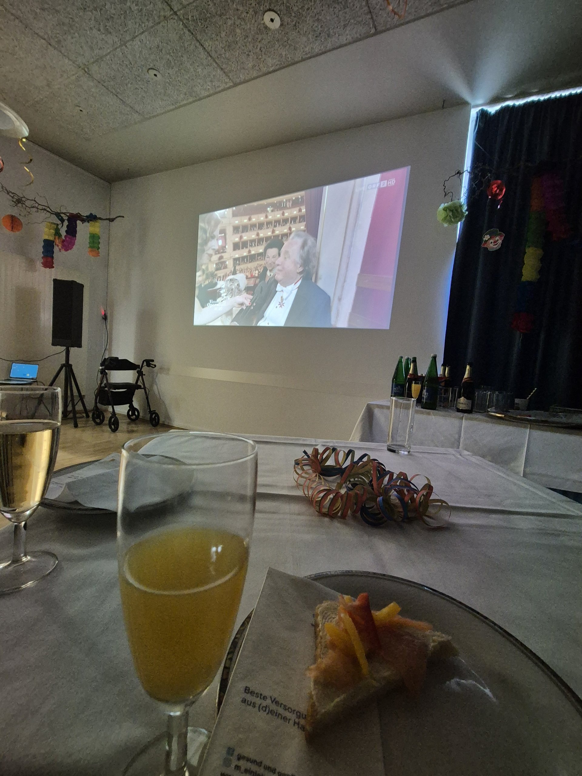Am Freitag fand das gesellschaftliche Highlight auch im PBZ Berndorf statt, es wurde nachträglich auf einer großen Leinwand der „Wiener Opernball“ bewundert. Der Höhepunkt des Faschings wurde - wie es sich gehört - mit einem Empfang mit Sekt und Lachsbrötchen begleitet. Bei jeder wohnbereichsübergreifenden Veranstaltung wird sichtbar, wie sehr die Bewohnerinnen und Bewohner es schätzen ihre sozialen Kontakte untereinander zu halten und auszubauen.