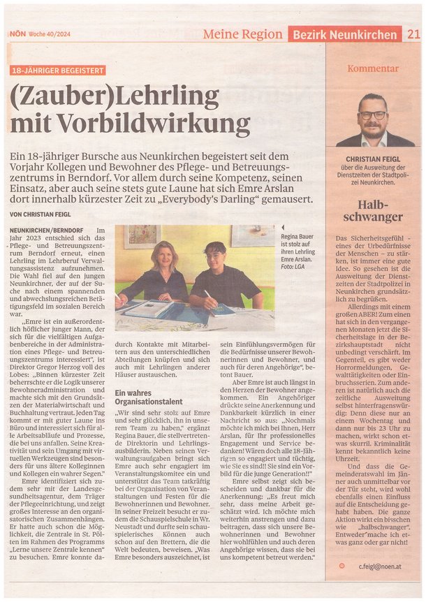 Im Jahr 2023 entschied sich das Pflege- und Betreuungszentrum Berndorf erneut, einen Lehrling im Lehrberuf Verwaltungsassistenz aufzunehmen. Die Wahl fiel auf Emre Arslan, einen jungen Neunkirchner, der auf der Suche nach einem spannenden und abwechslungsreichen Betätigungsfeld im sozialen Bereich war.